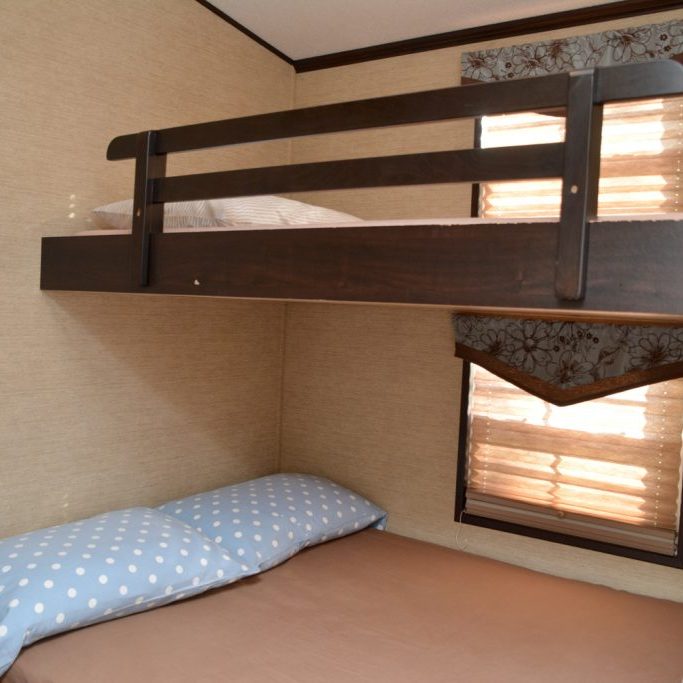 Details: 2 bedrooms, one with queen bed and the other with single-over-double bunk bed. Sofa bed in living room. 4-piece bath.